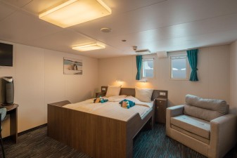 With the highest ice-class classification (UL1 equivalent to 1A), the Ortelius is exceptionally well-suited to navigate through solid one-year sea ice and loose multi-year pack ice, making it possible to explore remote locations such as the Ross Sea and Franz Josef Land. It comfortably accommodates up to 108 passengers in 52 cabins, providing ample open deck space and a large bridge that passengers can explore.